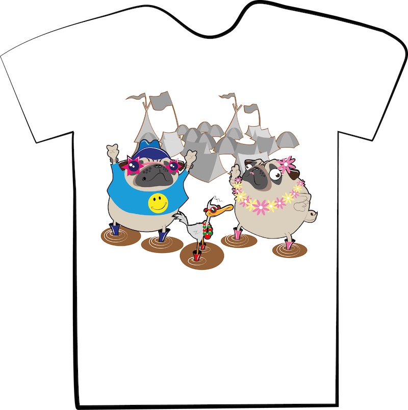 Pug and Duck cartoon t shirt designed by Mick Wright Caricatures. Impress fellow festival goers with this unique design from the Pug and Duck range before it gets covered in festie mud and grime. Production being vegan friendly, using inks that contain no animal by products. Printing will last the lifetime of the garment….promise!